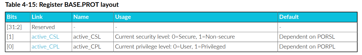 이때 RESET에 있는 privilege, security 값을 읽어 PROT 레지스터에 반영하게 된다