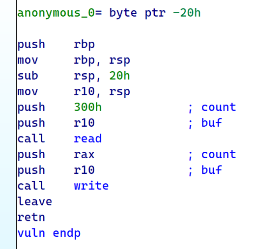 count=read(0,r10,0x300) //r10 ([rbp-0x20])