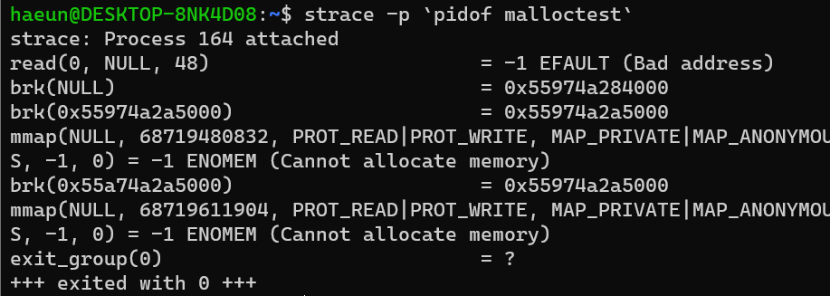 - 그리고 커널에서 sbrk, mmap 시스템콜에 의해 할당된다. 아마 malloc같은 애 안에서 최종적으로 저 syscall을 호출하는 듯? 궁금해서 strace로 돌려봤다.(참고로 돌린 코드는 ptmalloc2 사용) 소스코드는 그냥 멈춰서 분석하기 위해 read 한 번 해주고 malloc(0x30), malloc(0x1000000) 해준 코드다
