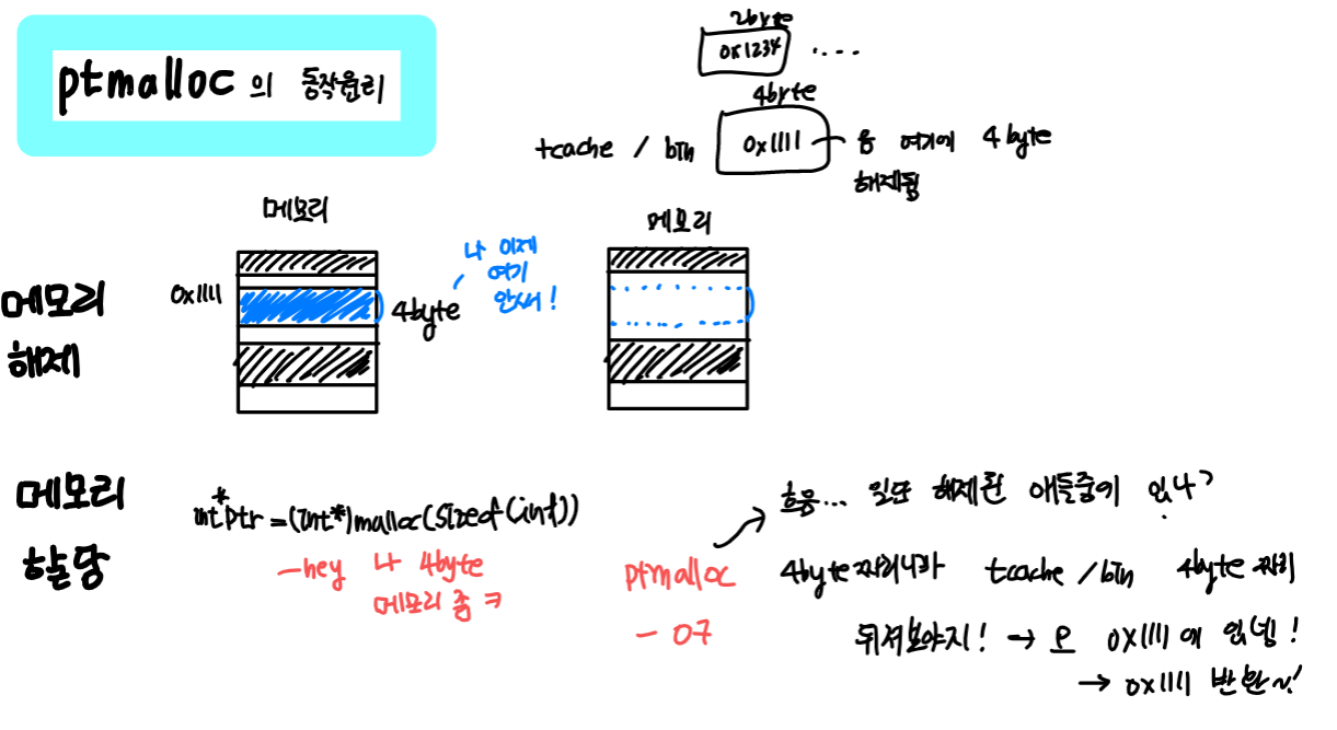 - ptmalloc은 어떤 메모리가 해제되면, 그 메모리의 특징을 기억하고 있다가(tcache/bin에 크기별로 저장) 비슷한 메모리의 할당 요청이 오면 해제된 메모리에서 쓸만한 메모리를 찾고 걔를 바로 반환해줌 (마치 집을 다시 짓는게 아니라 빈 집을 주는 것처럼) 또한 예를 들어 4byte짜리 메모리 할당해달라고 하면 tcache에서 4byte짜리 있는지 찾아봄