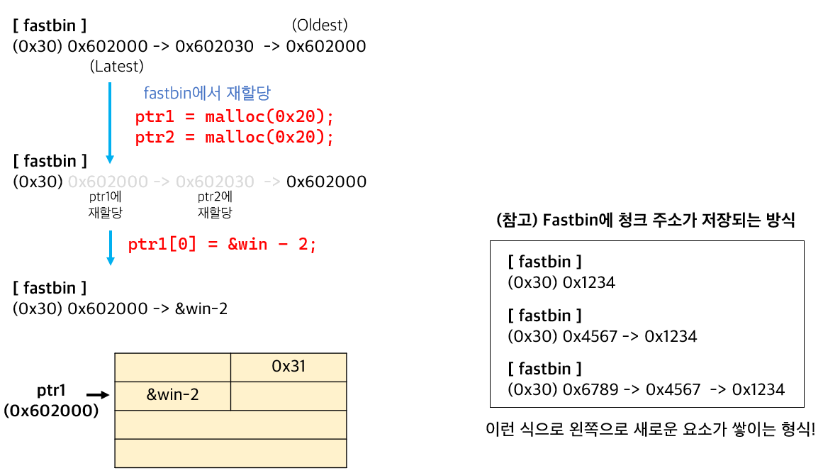 fastbin에는 원래 0x602000(Latest), &win-2가 있었는데 재할당을 해줬으므로 ptr3에는 0x602000가, ptr4에는 &win-2가 재할당된다. 한편, ptr4에 바로 &win-2가 재할당되지는 않는다. fastbin크기의 힙을 할당하기 전에는 위에서 언급했듯, 할당하려는 힙의 크기가 실제로 fastbin의 크기가 맞는지 검증하는 과정을 거친다.