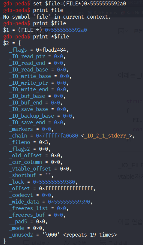 | _IO_jump_ t *vtable | 파일 관련 작업을 수행하는 가상 함수 테이블입니다. //얘는 조금 더 뒤에 다루겠다. |