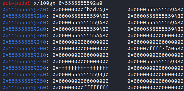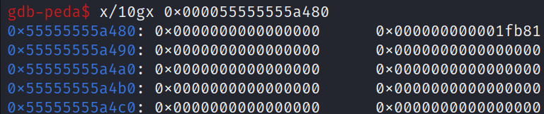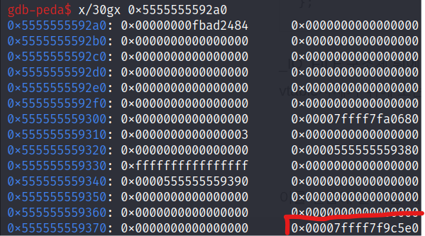 0x555555559480이라는 값이 8번 적혀있다. 적힌 위치는 위에서 보았던 포인터들이다.