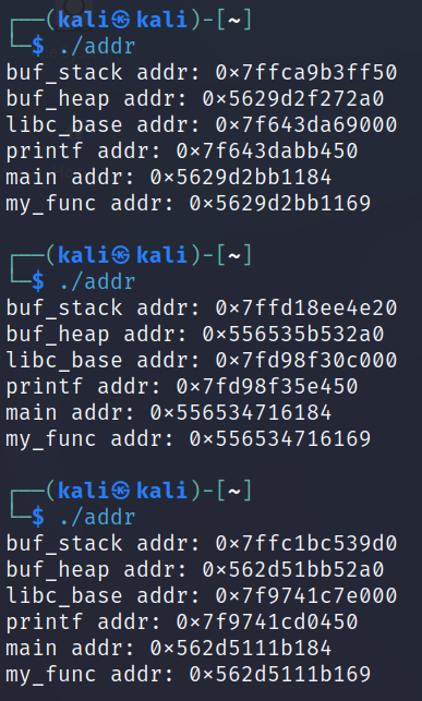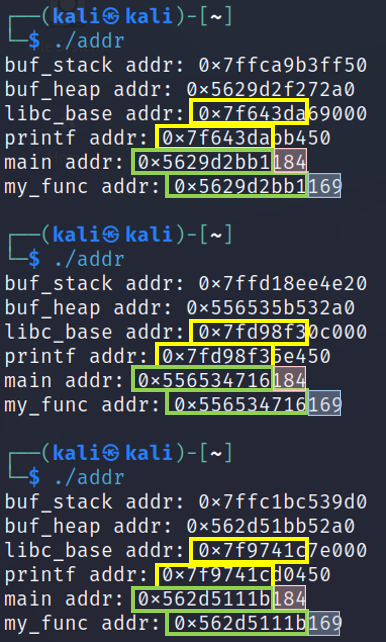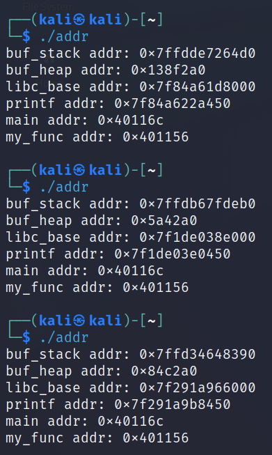 스택, 힙, 라이브러리 주소, 라이브러리의 printf 주소 뿐만 아니라 내가 정의한 my_func의 주소와 main함수의 주소도 무작위로 배치되고 있다.