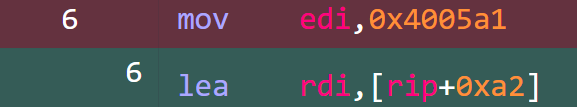 초록색으로 하이라이트 된 코드를 보면 절대주소(0x4005a1) 대신 [rip+0xa2]를 쓰고 있다. 그러니까 코드의 위치가 바뀌어도 언제나 rip와 0xa2만큼 떨어진 곳의 데이터를 가져오기 때문에 항상 같은 값을 가져올 수 있다. 왜냐하면 오프셋은 계속 동일할 것이기 때문이다.